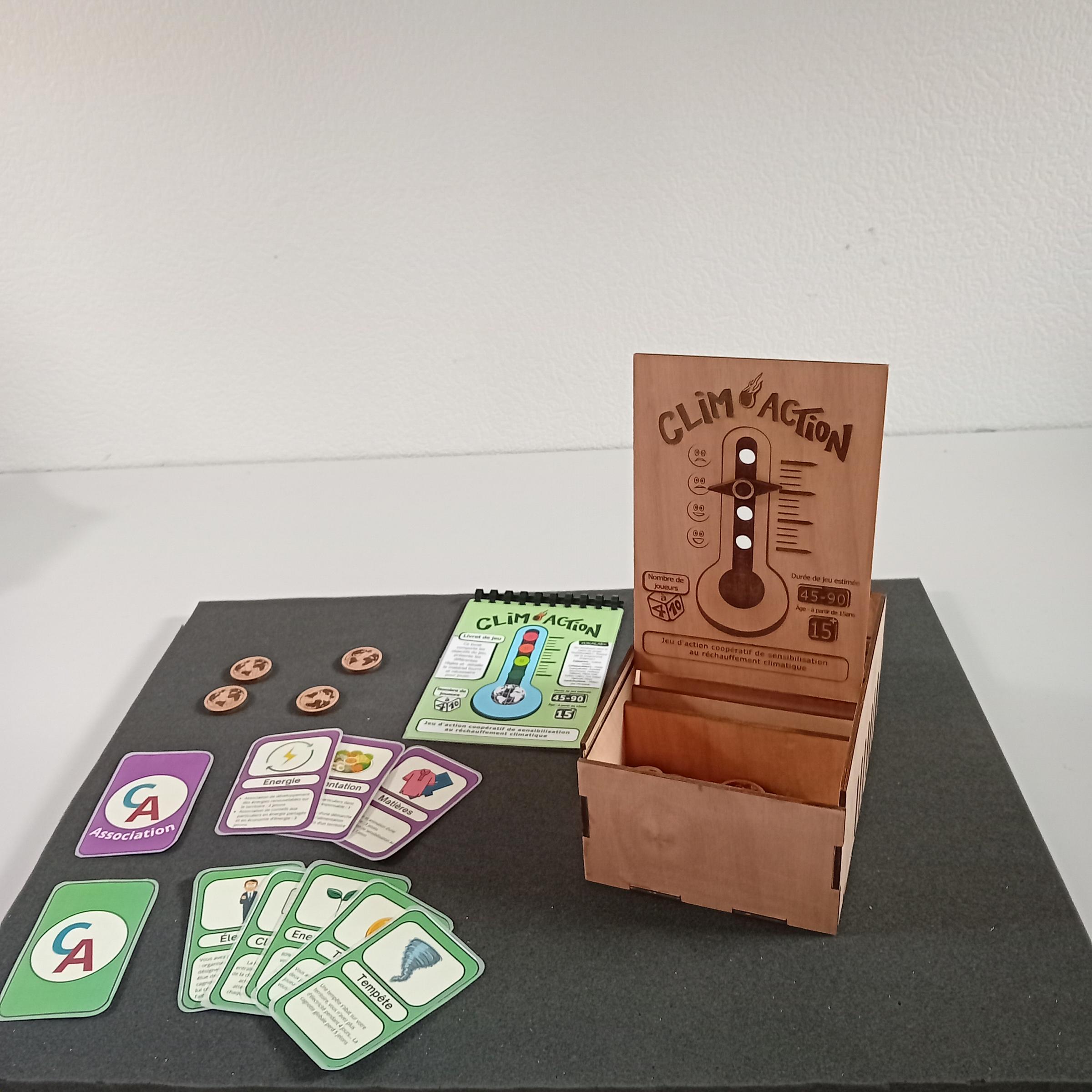 Clim’Action est un jeu coopératif conçu pour mieux comprendre les effets des changements climatiques, sensibiliser chacun à son rôle dans la lutte contre ces changements et révéler les interdépendances entre les différents acteurs impliqués. Il offre un espace ludique pour explorer les enjeux collectifs et imaginer des stratégies d’action concrètes.