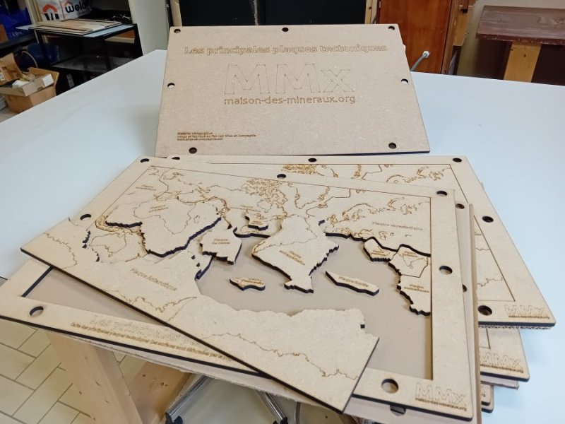 Plateau pédagogique sur la tectonique des plaques forme de puzzle, utilisé à la Maison des minéraux en ateliers avec les scolaires.
